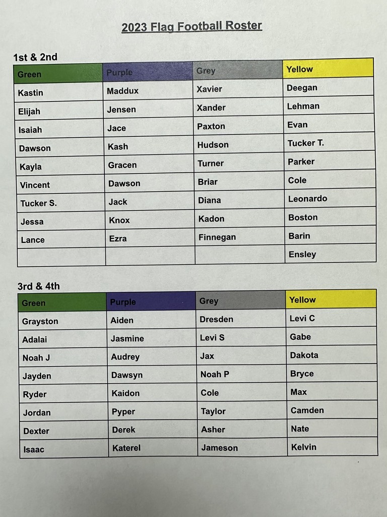 Due to circumstances beyond our control the shirts for tonight's flag football game are not in yet. Please try to have your child wear their respective color for the game. 1st & 2nd grade plays at 5pm and 3rd & 4th plays @ 5:30. Players should try to arrive 10 minutes before their game